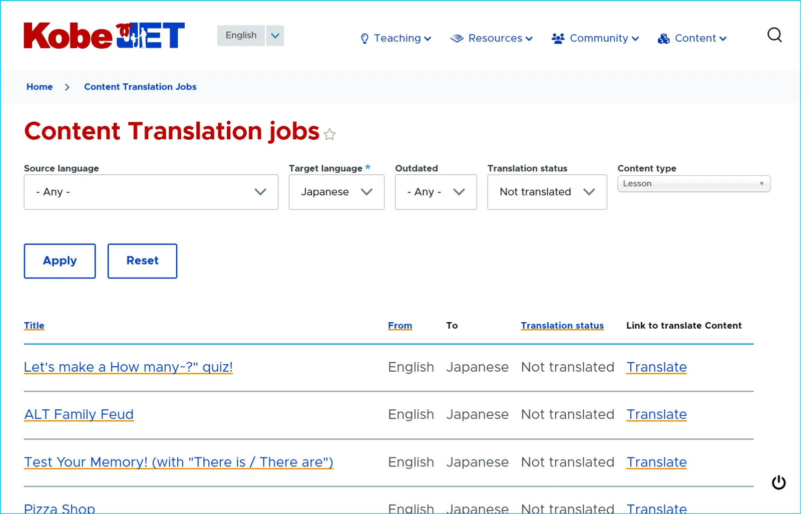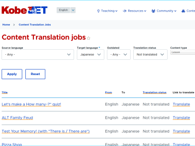 The Lessons library is the most popular resource on KobeJET. Currently there are just over 500 lessons available in English. Of those, only 118 have been translated into Japanese for easier searching, reference, and use by HRTs and other native Japanese educators.